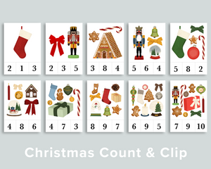 Print these festive 1-10 Christmas Count and Clip Cards and add them to your morning basket, print as nursery decor, or use in your homeschool curriculum!